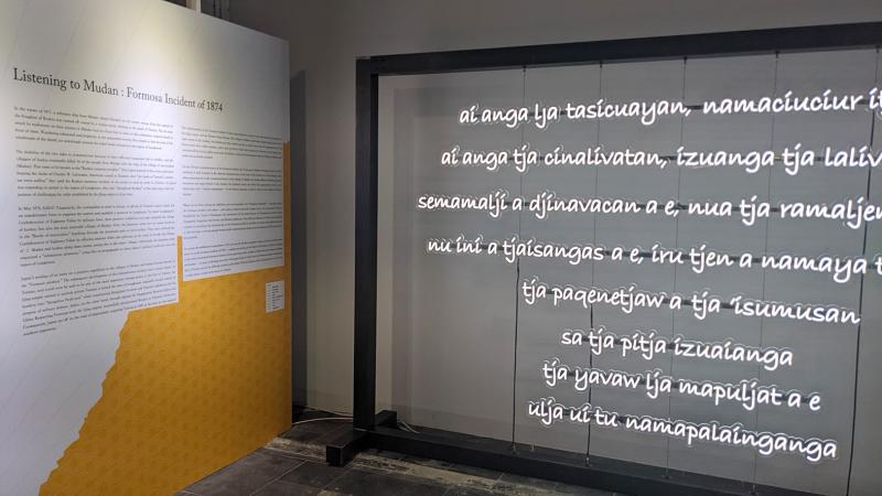 A recording of Paiwan singers from Sinevaudjan Village echoes through the exhibition room, the lyrics looking back at the hardships their ancestors suffered to give them the life they have today. Nearly 150 years ago, the village was wiped off the map by the Japanese during the Mudan Incident (牡丹社事件), and it took 36 years for the people to return and rebuild it.