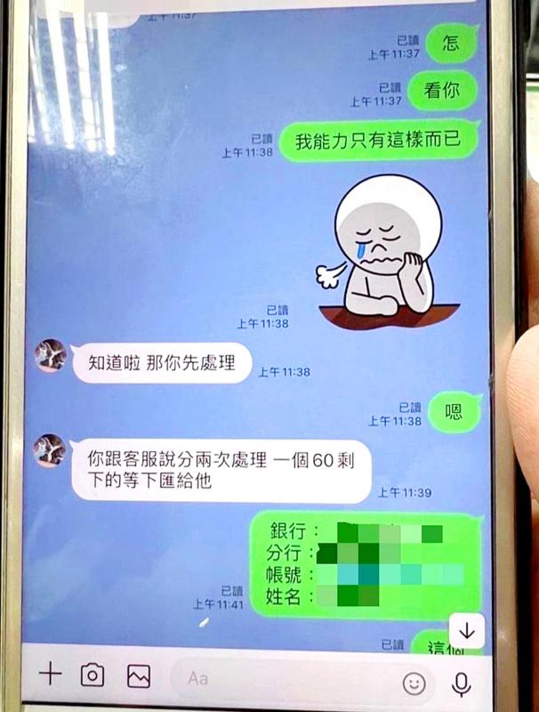 According to the Liberty Times (the Taipei Times’ sister paper), victims often refuse to believe that they were victims of a scam. The paper reported at least nine other similar cases over the past month, and not all were able to retrieve their cash.