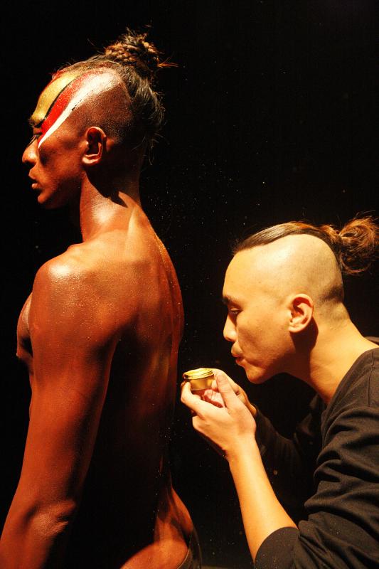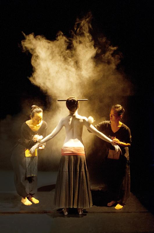 The performance begins with the entire troupe chanting the Heart Sutra from Mahayana Buddhism, which choreographer Lin Lee-chen (林麗珍) says is an integral part of the piece. Wu and Lee each claim half of the stage and begin the first movement: combing their hair. Every step is ritualized and carried out in silence.