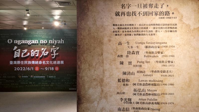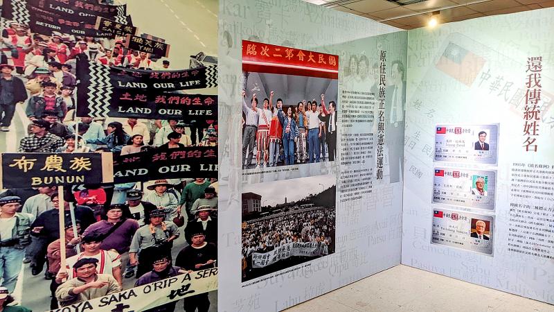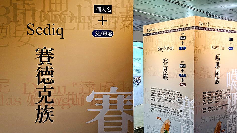 The exhibition, which opened in January at the National Central Library but is currently on view at Ketagalan Culture Center (凱達格蘭文化館) in Taipei’s Beitou District, details the varying naming customs of the 16 official indigenous groups, how they were forced to adopt Japanese and Chinese names and their struggle during the 1980s and 1990s to revert to their “true names.”