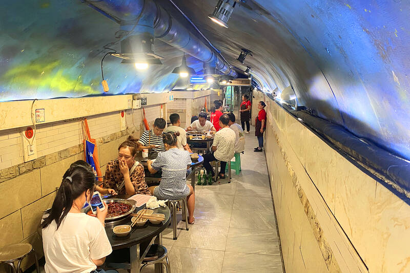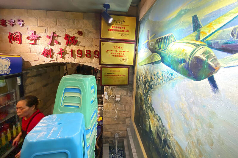 Red Chinese characters hang over one entrance, its stonework half-hidden by a refrigerated drinks display case and stacked up plastic chairs. The characters read: “Cave Pavilion Hotpot. Founded 1989.” Inside, tables and chairs line two long and narrow tunnels connected by a corridor. A starry night sky has been painted on the semicircular roof to reinforce a feeling of coolness. A painting of a World War II fighter plane hangs on the wall.