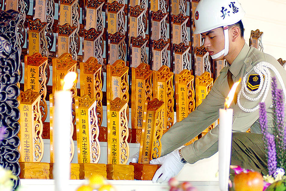 Then-Hsinchu County magistrate Liu Chi-kuang (劉啟光), who was on a national Martyrs’ Shrine committee, suggested that Taiwan’s rituals should be unique. He proposed holding the spring ceremony on April 17, the anniversary of the Qing Dynasty’s ceding of Taiwan to Japan in 1895, and the fall event on Oct. 25, the day of formal Japanese surrender. The main deity should be Cheng Cheng-kung (鄭成功, or Koxinga), who expelled the Dutch from Taiwan in 1662 and established the first Han-led government in present day Tainan.