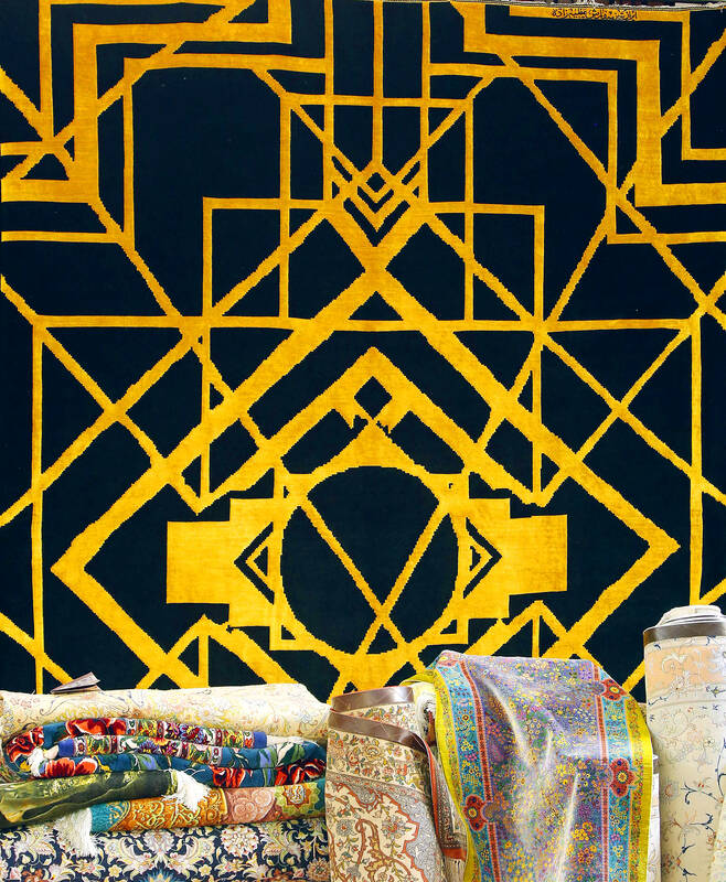 Among the new styles on display at the exhibition which ended Sunday: a rug featuring small squares of hypnotic diagonal blue and white lines. Another depicts diamond and other geometric patterns in gold silk on a black background. One wool rug looks as if an ink roller has left splashes of gold on it.