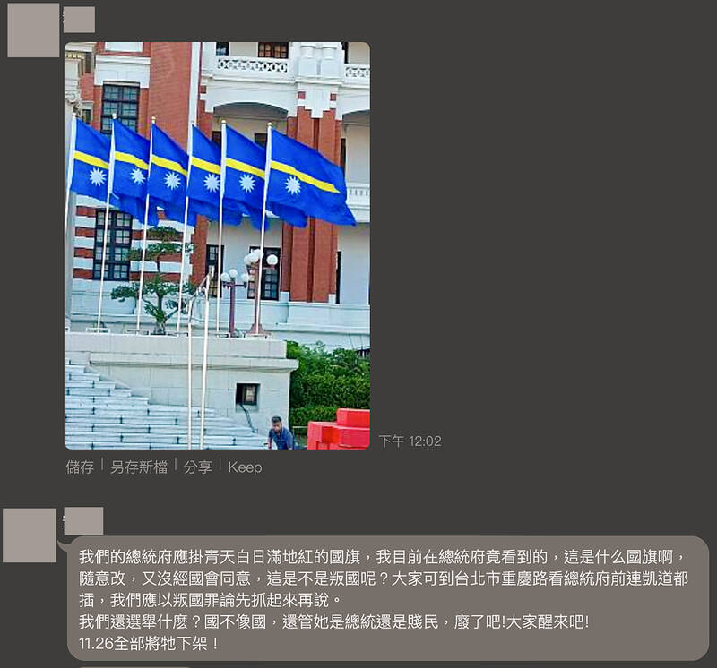 The poster added: “We should arrest them [the DPP] for treason and take it down on Nov. 26. The flag in front of the presidential palace is a fraud, the flag of a bandit gang?”
