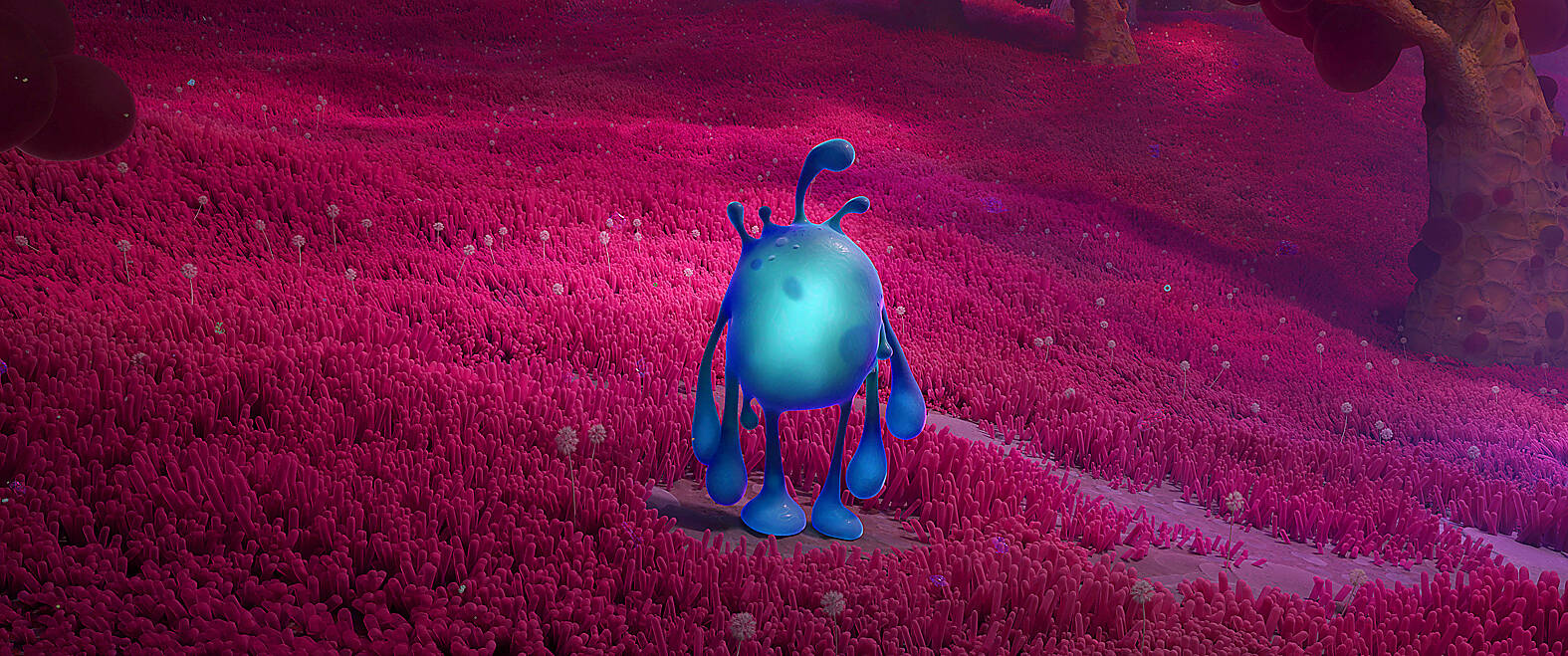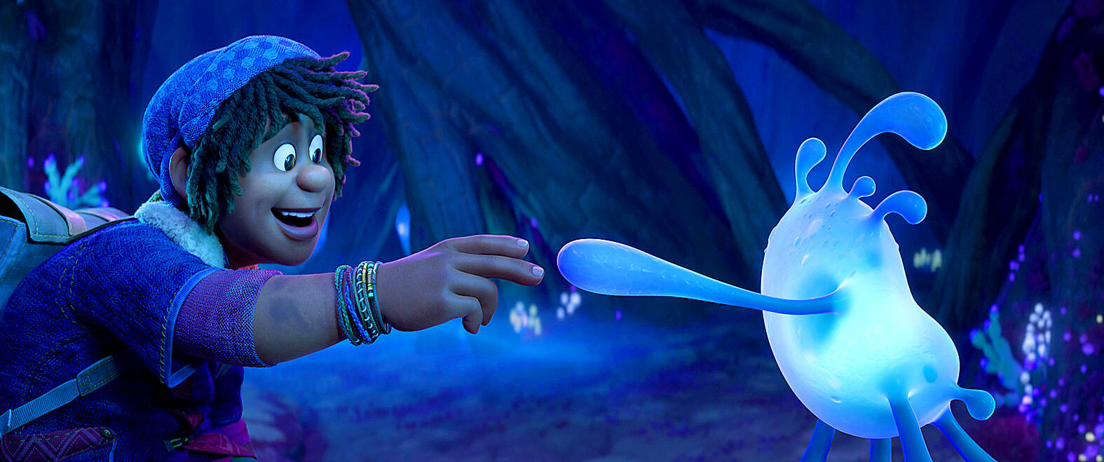 And who should turn up but Jaeger himself? He has some explaining to do. Turns out he got stuck in a stunning, scary, strange underworld. And it’s beautiful. Directors Don Hall and Qui Nguyen have created a stunning universe of psychedelic colors and creatures, most memorably in hues of deep pinks and purples. Wondrous creatures emerge, and also one of the cutest little blobs you’ve ever seen, the aptly named Splat, who befriends Ethan.