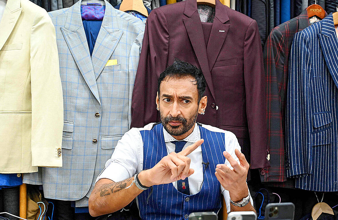 With the help of assistants broadcasting a dizzying array of choices over video call, Melwani steers Tim towards a burgundy three-piece with an inner lining featuring pin-up girls.
