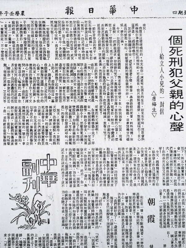 It ran in the literary supplement of the China Daily News (中華日報) on Jan. 18, 1972, and marked the beginning of Tang’s literary career, which included several awards and a movie adaptation. He was the nation’s first inmate to pay taxes on book royalties.