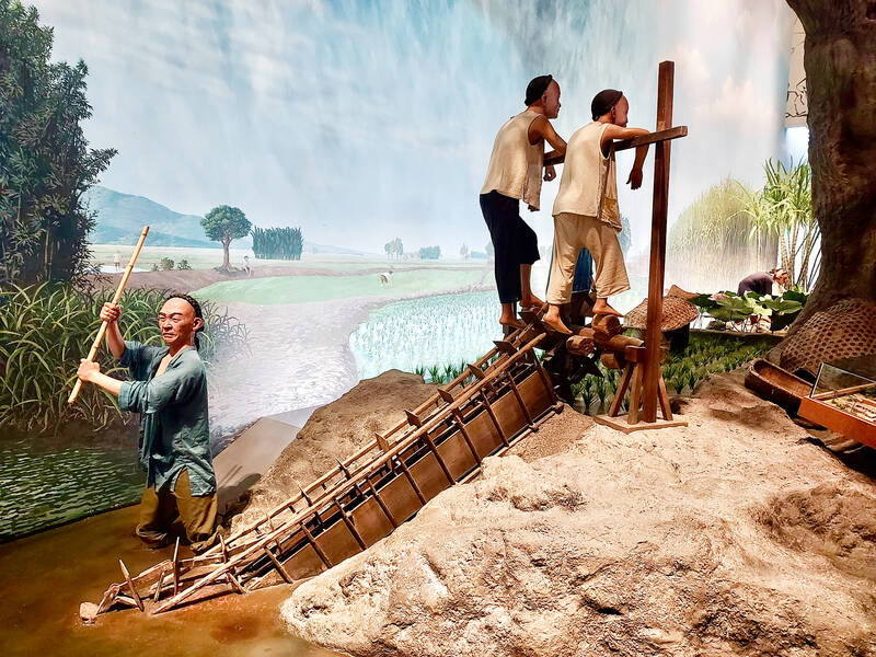 Coastal areas in Tainan used to be an inland sea with fish farms, salt fields and little in the way of ground transportation. Low-draft boats with sails that could be poled forward were a favored means of transportation for Han merchants. One such punt (a tshiu-the-a in Hoklo, also known as Taiwanese) was eventually abandoned on the shore of the Yanshui River and later rediscovered and dredged up. It now occupies a prominent spot on the museum’s first floor.
