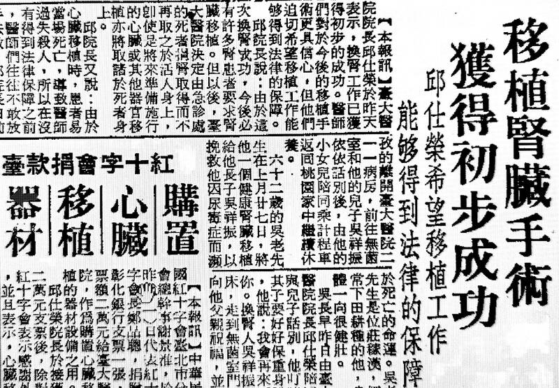 Lee Chun-jen had been preparing for the moment for three years, first heading to the US to study at an organ transplant research center, and then experimenting on hundreds of dogs with his team. They kept a 24-hour watch over the animals, checking their heartbeats, blood pressure, white blood cell count and administering anti-rejection drugs. The entire effort cost about NT$140,000 (nearly NT$1 million today).
