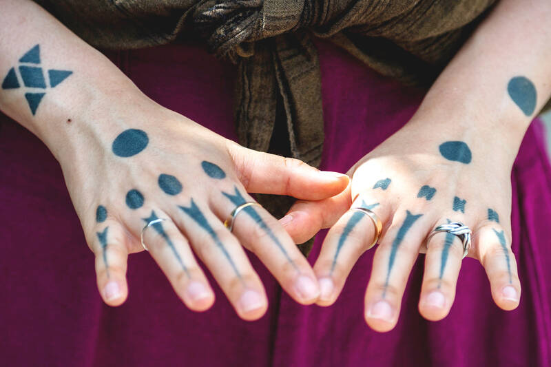 She wears hajichi shaped like arrows on the tops of all her fingers, dots and geometric patterns on the backs of her hands and larger versions around her wrists.