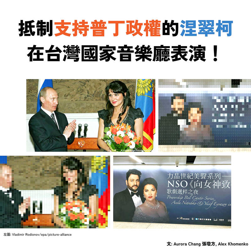 Following a sustained social media and e-mail campaign involving volunteers from the nongovernmental organization Taiwan Stands With Ukraine (TSWU, 台灣烏克蘭陣線), the National Symphony Orchestra agreed to call off a concert by Russian soprano Anna Netrebko set for March 5 at National Taiwan Concert Hall.
