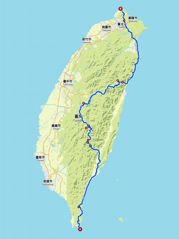 >> The map above shows the initially planned route. Some minor adjustments were made, and the final route ended up as follows: After celebrating a friend’s birthday with her on the first day’s walk, Sandbrink and Florian made their way to the east coast, went up the South Cross-Island Highway and crossed Yushan National Park from south to north, hitting Jade Mountain along the way. From there they went to Sun Moon Lake and took some time off to celebrate Lunar New Year. Florian had to leave then, but Sandbrink continued solo up through the backwoods to Wushe (霧社), and then on the highway over to Taroko Gorge via Hehuanshan and another high mountain side trip. After walking up the east coast as far as Waiao (外澳), he then made his way to Taipei via Pingsi (平溪), and finally northward through Yangmingshan to Fuguijiao Lighthouse.