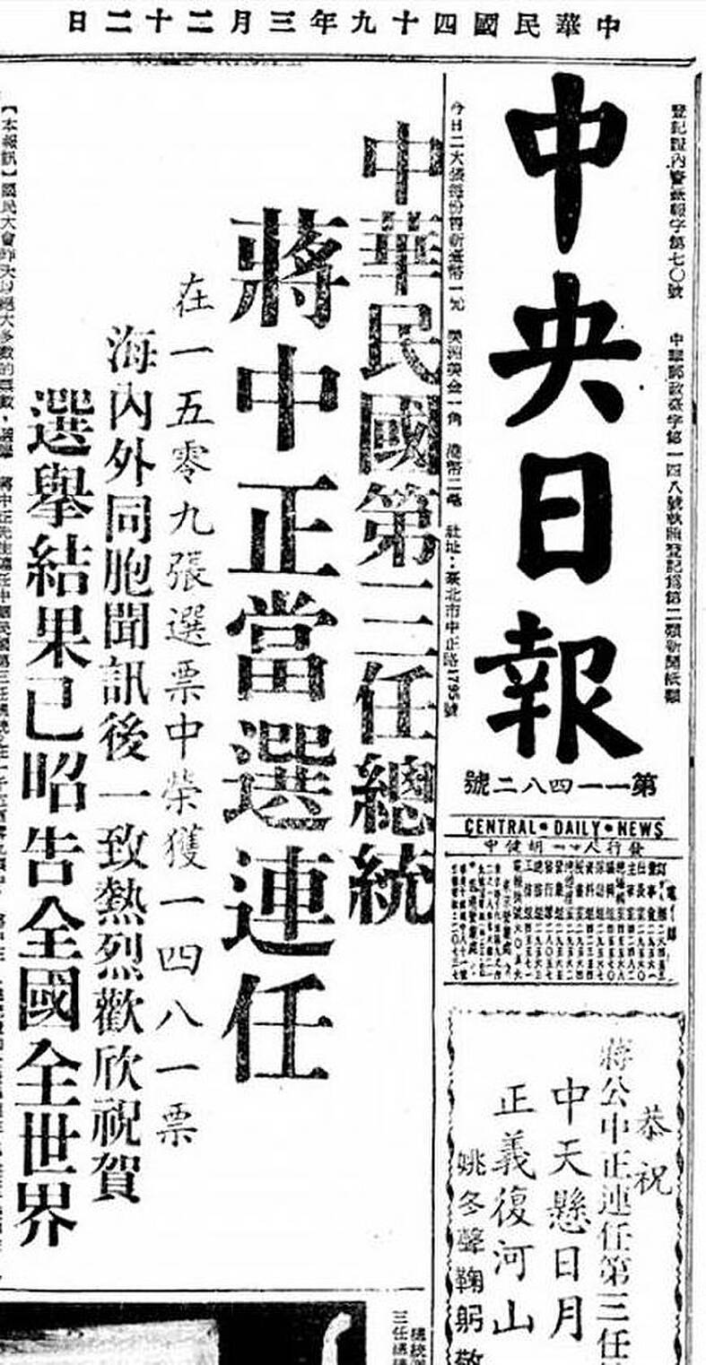 Taiwan provincial governor Chen Cheng (陳誠) was adamantly opposed to the state-run Central Daily News (中央日報) moving from Nanjing to Taipei in 1949.
