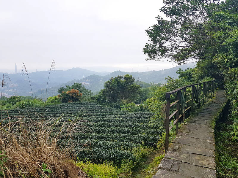 After spending 20 minutes at the temple, we continue along the stone steps, which snake their way up Ejiaoge Mountain. Eventually the trail levels off, and leaves the dense foliage of the lower elevation behind. This part of the walk features creeks with plenty of fish, orchards, the occasional farm house and patches of bamboo. At one point, the pathway emerges to open views of a tea plantation in the foreground and Taipei 101 in the distance.
