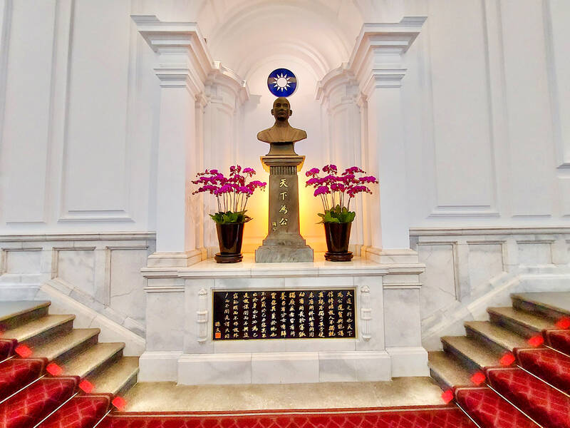 Straight ahead is a staircase that ends in a landing before splitting into two staircases heading left and right to the second floor. On the landing is the focal point of the room, a bronze bust of Sun Yat-Sen (孫中山), founding father of the ROC. The current statue was installed in 1958, then placed in a warehouse when the entrance hall was “redecorated” during the presidency of Chen Shui-bian (陳水扁), before finally being restored in 2008 by newly-elected president Ma Ying-jeou (馬英九).