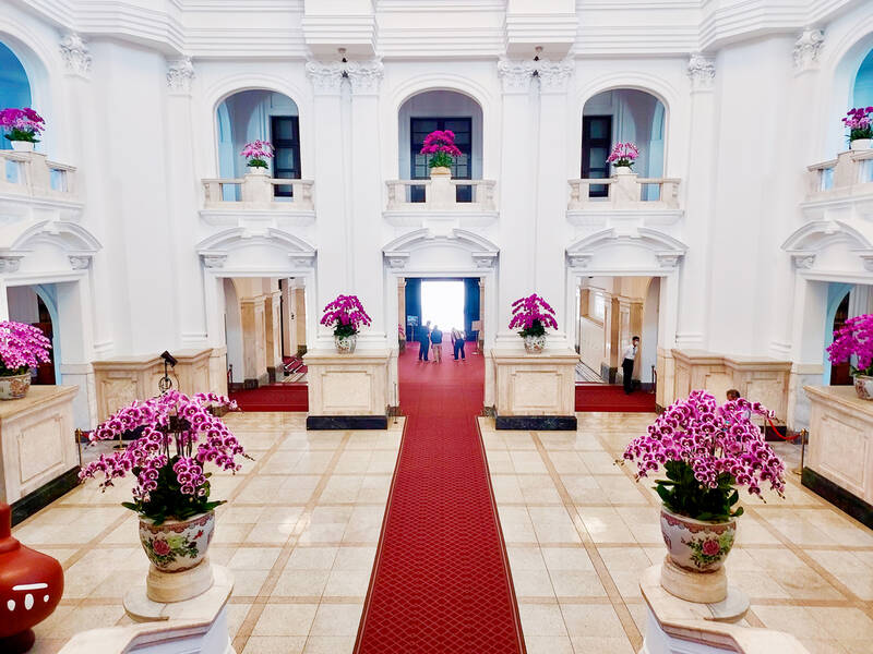 One of the highlights of the tour is the Reception Hall on the third floor. This is a rather plain room with a vaulted ceiling and wall-to-wall red carpeting. In the center of the back wall, above a dais, hang the ROC flag and a portrait of Sun Yat-Sen, flanked by pots of orchids. This room appears often on the news as the location of important ceremonies and news conferences. Former US House of Representatives speaker Nancy Pelosi, for instance, was awarded the Order of Propitious Clouds with Special Grand Cordon in this room during her controversial Taiwan visit last year.