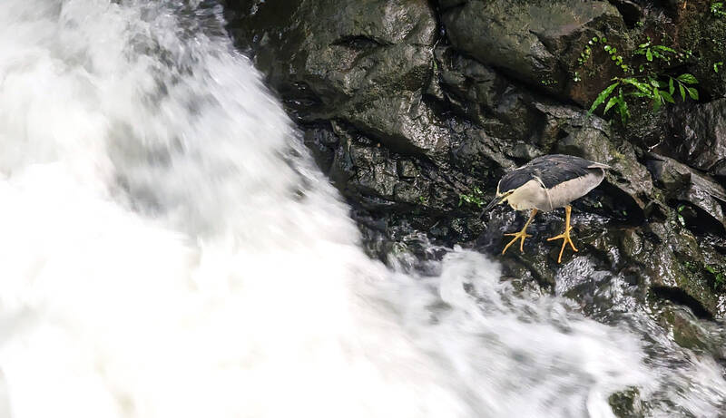 I go up from Shuangcheng Road, a small paved route hugging a stream. Behind some dilapidated buildings on the right are a pottery studio and a cat cafe that seems pretty popular from its online reviews. Both are reservation only and unfortunately I’m allergic to cats. One can hike up to the park via the Changshou Pavilion path (長壽庭) that appears to the left, or continue on the road, where there’s a few scenic viewpoints of spots where the stream turns into waterfalls. I spot a Malayan night heron feeding by the rapids.