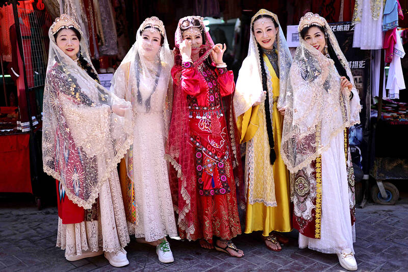 Dozens of stores catered to a trend for “travel snaps” taken by a professional photographer, where tourists can pay over 1,500 yuan (US$205) to don spangled veils and pose around the city in Uighur clothing.
