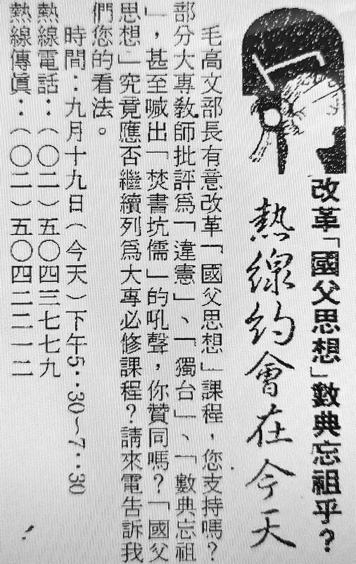 Lee Yuan-tse (李遠哲), who headed the Executive Yuan’s educational reform review committee, argued that one could finish reading the material on Sun Yat-sen Thought in three hours and there was no need to spend so much time on the subject.