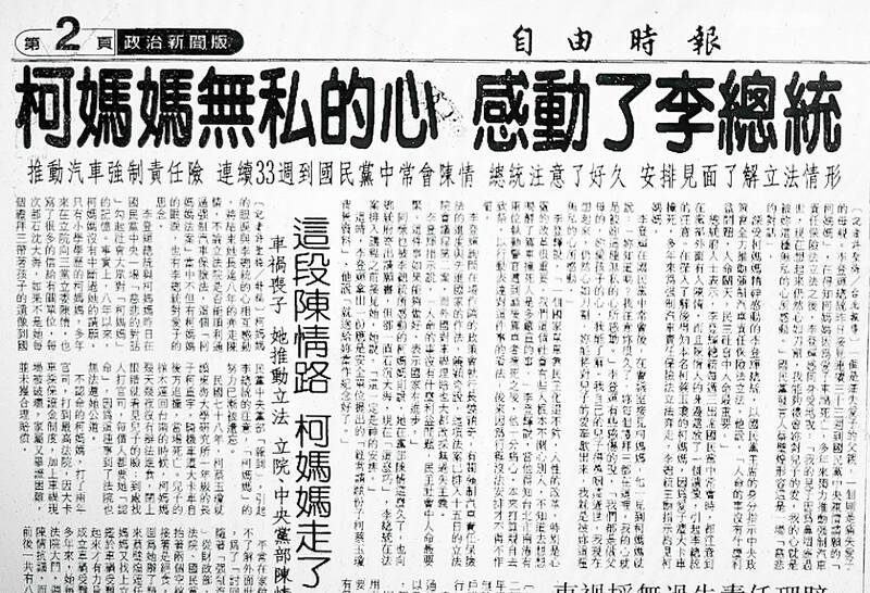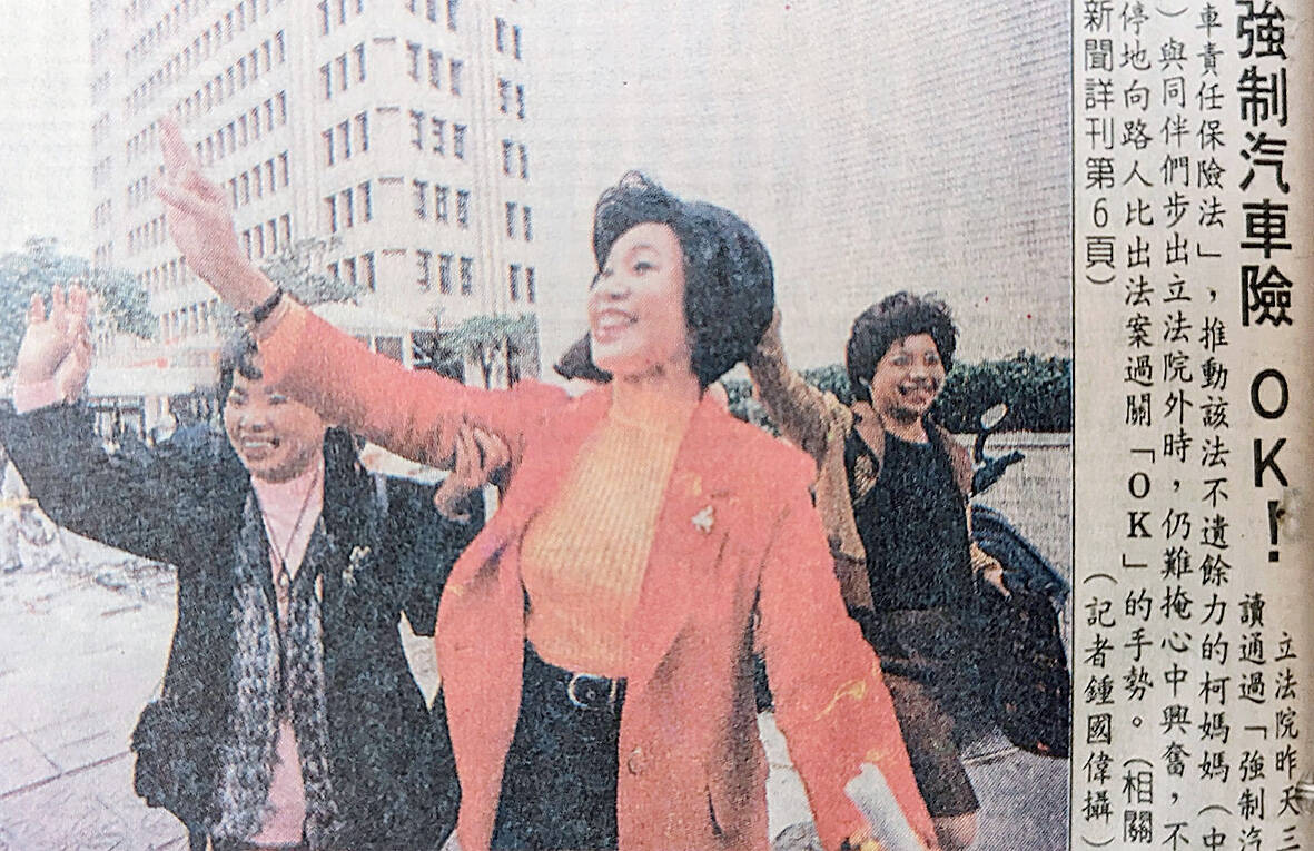 Nov 13, 1996 was the 33rd consecutive Wednesday that Ko-Tsai Yu-chiung (柯蔡玉瓊) appeared in front of the Chinese Nationalist Party (KMT) headquarters. The ruling party’s central committee meeting was about to start, and Ko-Tsai, better known as Mama Ko (柯媽媽), displayed photos of various car accident victims, lit some incense and began her usual ceremony to “induce the birth of the ‘Compulsory Automobile Liability Insurance Act.’