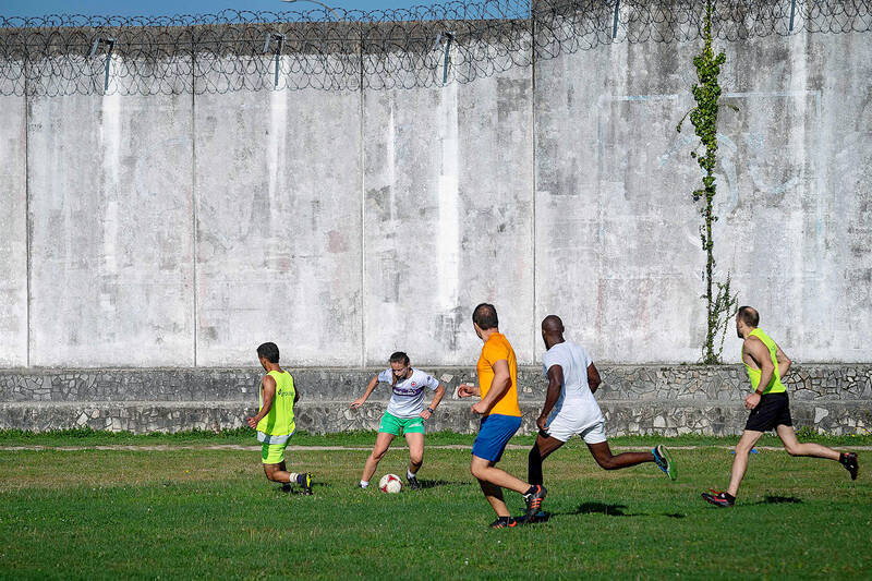 At a jail in northwestern Spain, a sole female inmate played football with 21 male convicts, part of a push towards mixed prison living that remains rare in Europe.