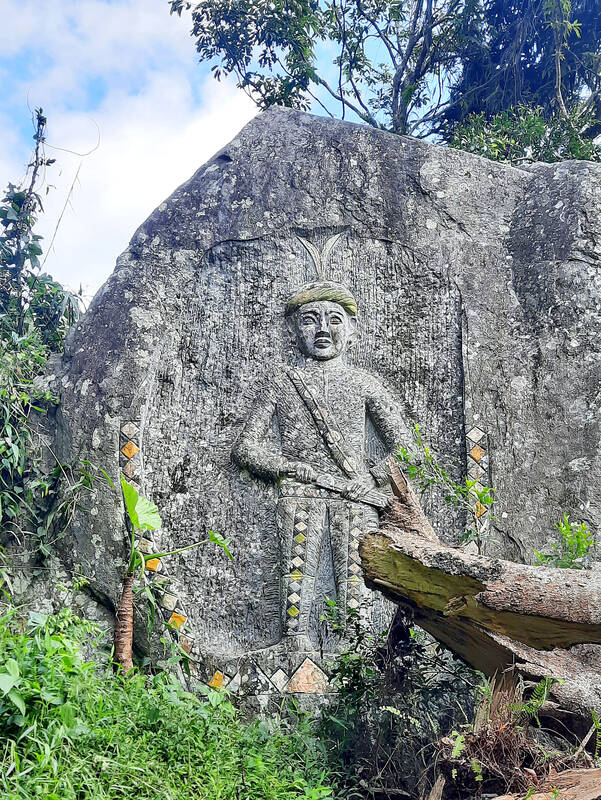 The trail is fairly steep, and after a while we could see a tiny patch of the Pacific, about 14 kilometers southwest of us as the crow flies. Passing a relief image of a tribesman carved onto a man-sized boulder, Nanu explained that it’s a recent work, and that the two eagle’s feathers in the man’s headdress signify that he’s been recognized as an effective hunter.