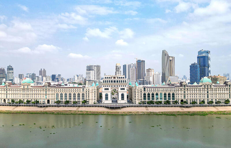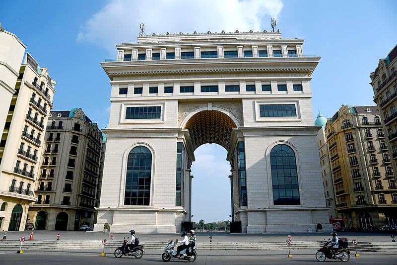 A replica of the Arc de Triomphe towers over a branch of the Mekong River, flanked by shops and apartments built in the style of the French capital’s signature Haussmann blocs.