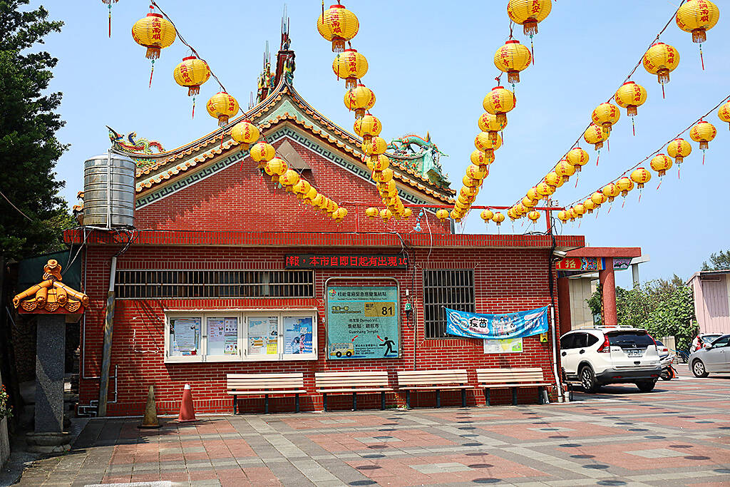 At the road’s edge stands Guanhang Temple (觀航寺), decorated with pretty yellow lanterns and scented with sandalwood. It’s forecourt is an ideal space to turn the bike around and complete the Shuangwan loop by following the bikeway back south again.