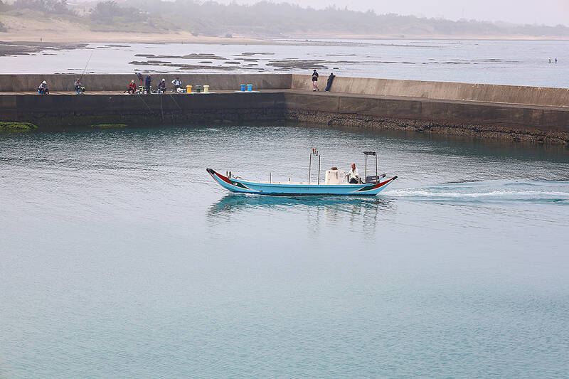 Given this rich maritime habitat, it comes as no surprise when the dedicated bikeway ends at Linshanbi Fishing Port (麟山鼻漁港), a rectangular harbor where several blue junks are moored. The boats have eyes painted on the bows, a tradition, I’d read, to help sailors find their way home in heavy seas.