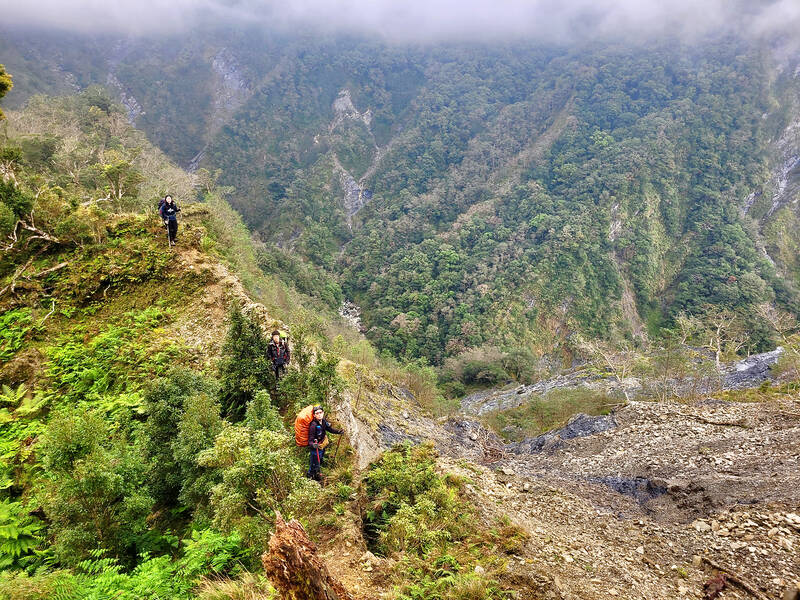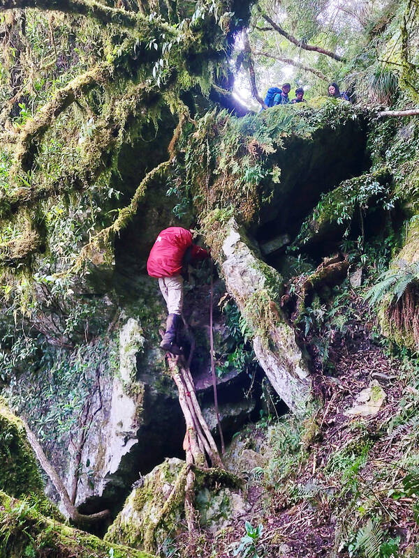 With the mining road wiped out, the way in to Small Ghost Lake has become a lot more difficult. Since it now takes four or five days to visit either Big or Small Ghost Lake on their own but only a week to visit both, most hikers now opt to see both at once. After leaving Big Ghost Lake, the route south to Small Ghost Lake passes the thrilling Yaobai Mountain (遙拜山), whose peak is reached by scaling a vertical rock wall using ropes and tree trunks and is only wide enough for about four people to stand on at once. The next major peak, Baican Mountain (拜燦山), does not get the adrenaline pumping as much, but does feature a cave nearby with golden lichen growing under impossibly dark conditions.
