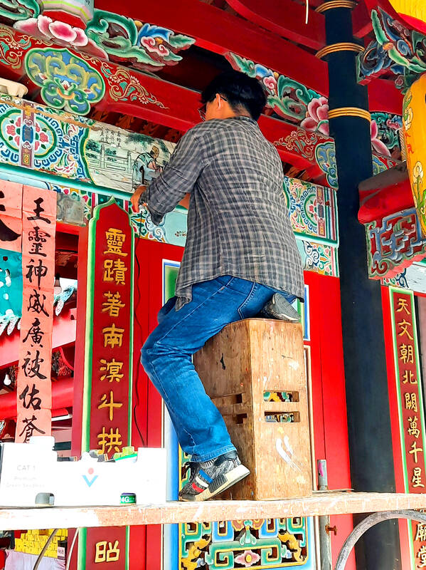 Four of the panels inside were painted by Pan Yueh-hsiung (潘岳雄), a third-generation temple artist born in 1943. They appear to be in reasonable condition, but images posted on the temple’s social media accounts earlier this year show wooden beams affiliated by severe cracking, flaking and fading. At the time of writing, work was ongoing.