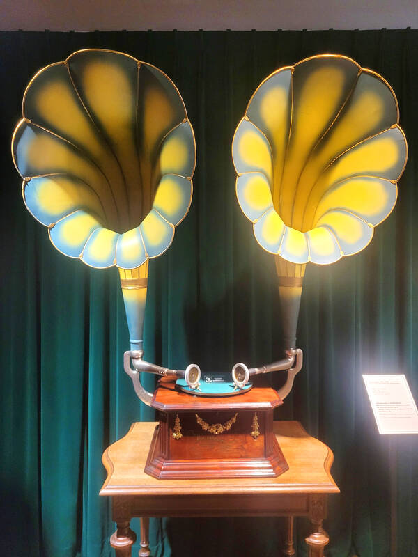The stereotypical phonograph in most people’s minds is a small box with a very large horn attached to amplify the sound. The museum has a number of these on display and, as with the music boxes, they are worthy of admiration for their careful craftsmanship and decoration alone, not only their ability to reproduce music. One horn on display was carved from a single piece of oak, while other phonographs feature two or even three horns painted in vivid colors that were used to project sound into a larger space like a dance hall. Other horns are in polished brass like the bell of a trombone.