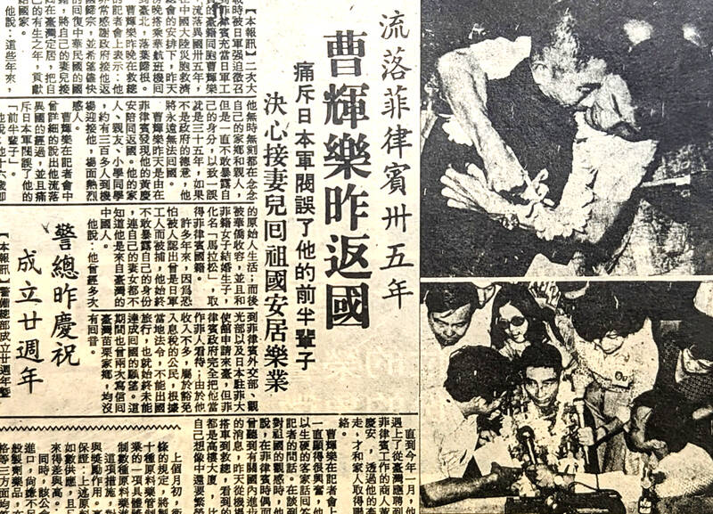 Tsao was not the first straggler to return from the Philippines. In 1956, Kao Chang-chin (高長欽) and Lin Chiu-tan (林秋潭) made the news after surviving in the jungles of Mindanao for 11 years.