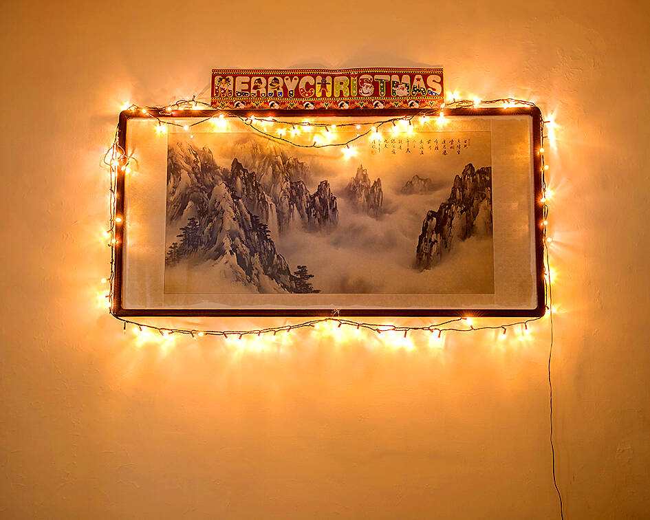 The images reveal a curious blend of east and west — a religious effigy in a banyan tree; Christmas lights decorating a classical ink painting.