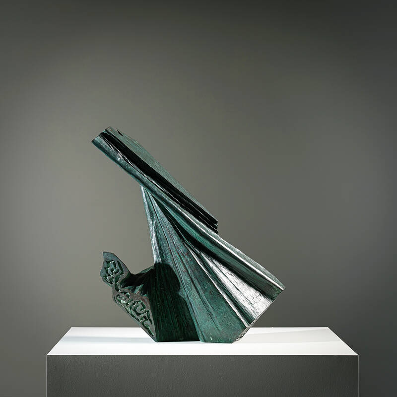 The bronze has been folded like silk and the lines engraved in it look like a fantastical ancient script.