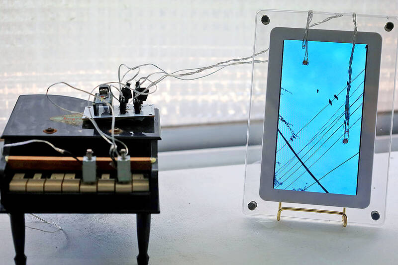 Each time a bird takes flight on the monitor screen, it triggers a sensor, which plays a note on the piano.
