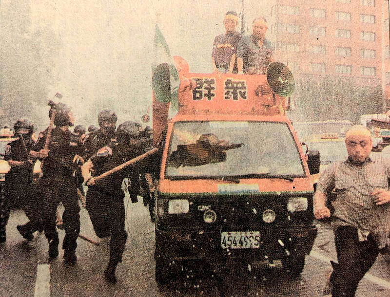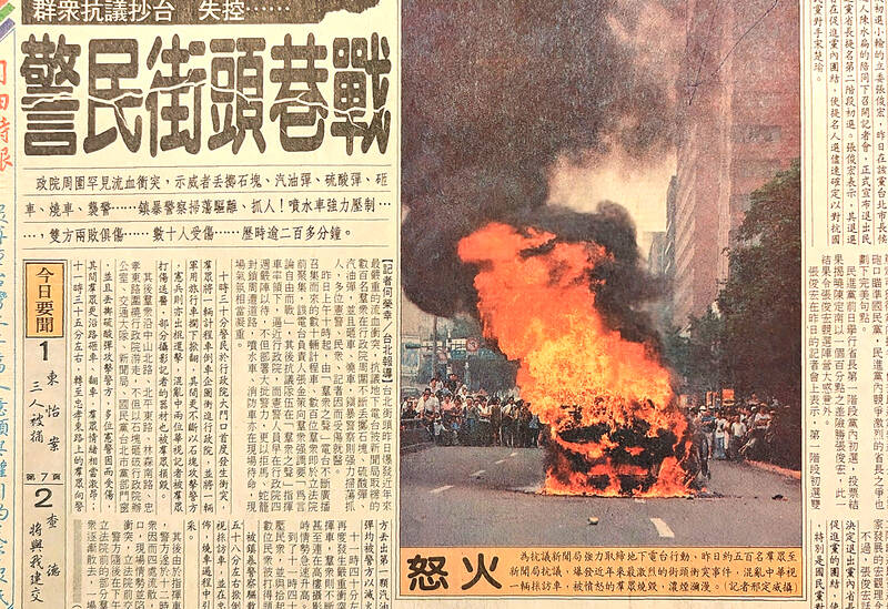 A furious crowd of about 500 people gathered at the Executive Yuan, circling the building while hurling rocks at the windows and police. Yelling, “Lian Chan (連戰, then-premier), come out if you dare, you son of a turtle,” they smashed and overturned surrounding vehicles, and at one point, a taxi tried to ram the main entrance. The demonstrators then started hurling gasoline bombs, clashing with police and setting a Chinese Television Service (華視) van on fire.