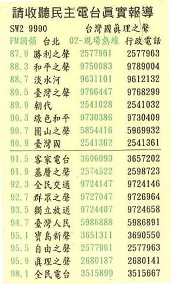 Chen Ching-ho (陳清河) writes in “The changing role of Taiwan’s illegal underground radio stations between 1991-2004” (台灣地下電台角色的變遷 1991-2004) that the first true underground station was Chuan Ming (全民), established in December 1992 by DPP legislative candidate Chang Chun-hung (張俊宏). Since most stations focused on KMT hopefuls, Chang sought other ways to connect with voters.