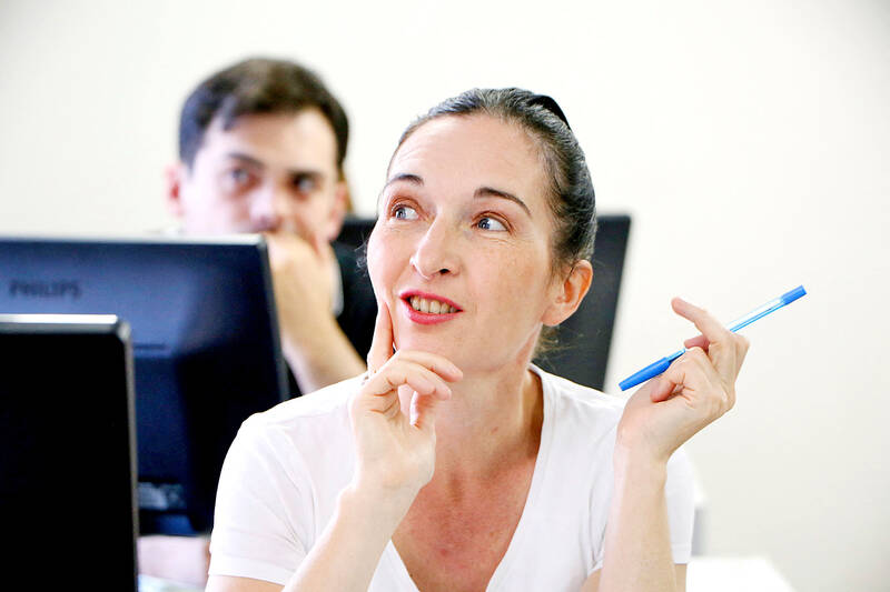 During the lesson, taught in Russian, some whisper to each other about tricky grammar points.