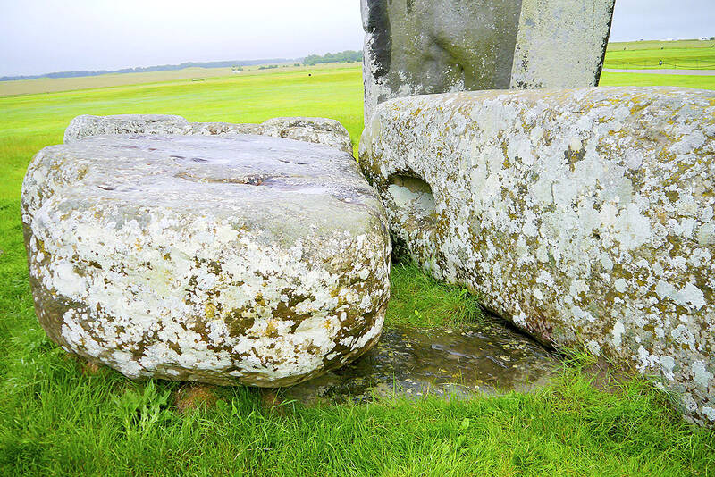 The altar stone is not one of Stonehenge’s famous trilithons — the immense, lintel-topped sarsen stones, which originate from a mere 25km away, and which today form its outer circle. Instead, the huge sandstone block, 5 meters long and weighing 6 tonnes, lies flat and semi-buried at the heart of the monument, trapped under two fallen sarsens and barely visible to visitors.