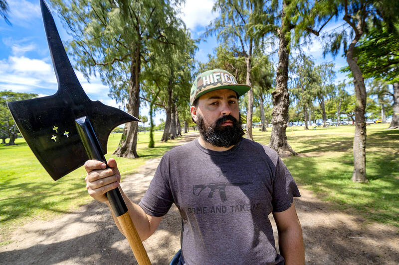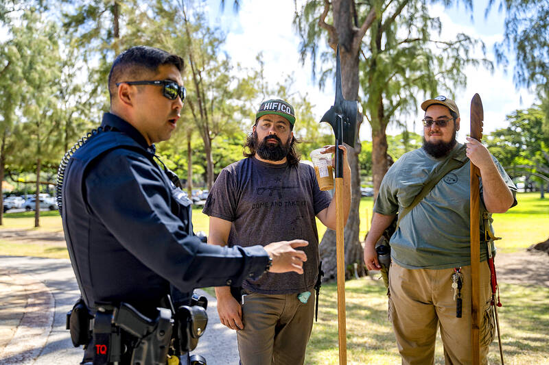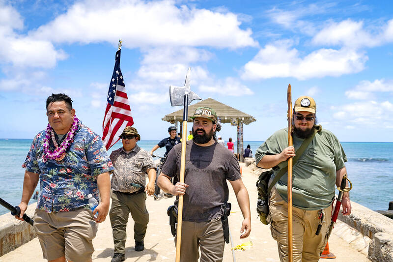 Honolulu police officers, who got wind of their plans to march through Waikiki in celebration of the law, chatted with them. Roberts told one he got his halberd blade on Amazon for US$56 (about NT$1,790). With officers escorting them, they strolled along Waikiki’s main oceanfront drag, Kalakaua Avenue. Some tourists did double takes, but many seemed unfazed by the armed men bearing a large US flag.