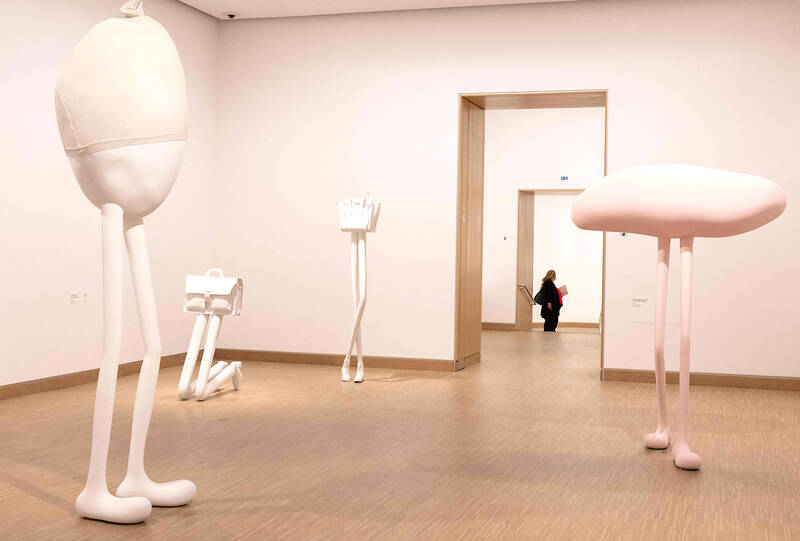 The show is a reflection on social norms, consumerist society and the diktats of appearance and even identity, with his quirky take on quintessentially Austrian staples such as sausages and pickled cucumbers alongside luxury bags on giant legs, miniature houses and stacks of clothing.