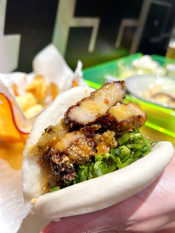 My recommendation is the meatball bao special (NT$150), a true east meets west concoction. Three crispy Italian-style meatballs of hearty ground beef, lashings of rich red wine sauce, American cheese and lettuce — fused with Asian flavors of cilantro, ground peanut, scrambled egg and that perfectly fluffy bao bun to hold it all together. This shouldn’t work, but it’s a fusion masterpiece.