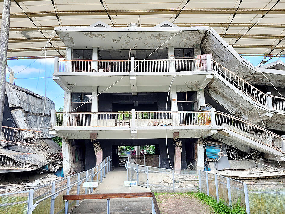 After the third gallery, it’s time to go for a walk outside on the grounds of the former junior high school for the climax of the tour. This is where the power of an uplifting faultline is in plain view and preserved for posterity. Two collapsed buildings and a damaged running track give visitors a perspective seldom seen anywhere else in the world.