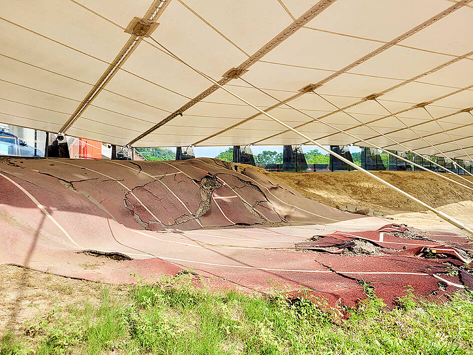 Next to this is the heavily damaged north classroom building, which sat right on the faultline itself. The uplifted ground starts outside the school entrance, passes through the collapsed north classroom building, and continues on all the way across the running track into the first gallery. The lines of the running track, once arrow-straight and level, are now folded and twisted impossibly upward. This is where the effects of a powerful earthquake on the shape of the Earth itself are most visible and is a good place to end your tour, right back on the faultline where you started.