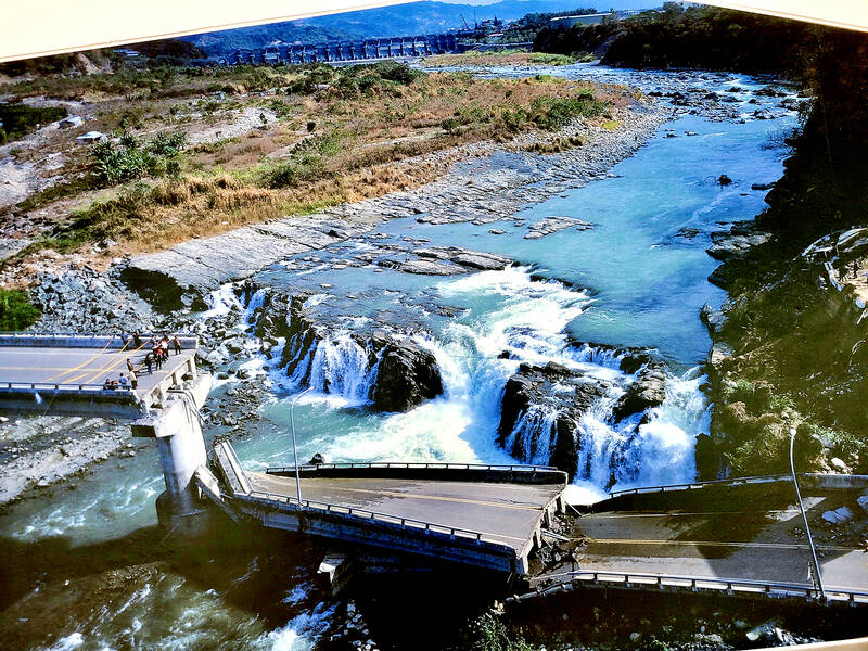 The museum’s first gallery, named after this fault, takes visitors on a journey along its length, from the spot right in front of them, where the uplift is visible in the exposed soil, all the way to the farthest reaches of the uplifting in Miaoli County. The fault is not a straight line but follows an erratic, curved path — reflected in the snakelike shape of this building — as it passes through different soil types and dodges mountains. Photographs show visitors the awesome damage wrought by the 921 Earthquake along the faultline as it toppled buildings, snapped bridges and even bent a dam, as well as the curious sights it created, like the new waterfall that appeared in the Dajia River (大甲溪), and rows of tea plants made crooked by the shifting ground.