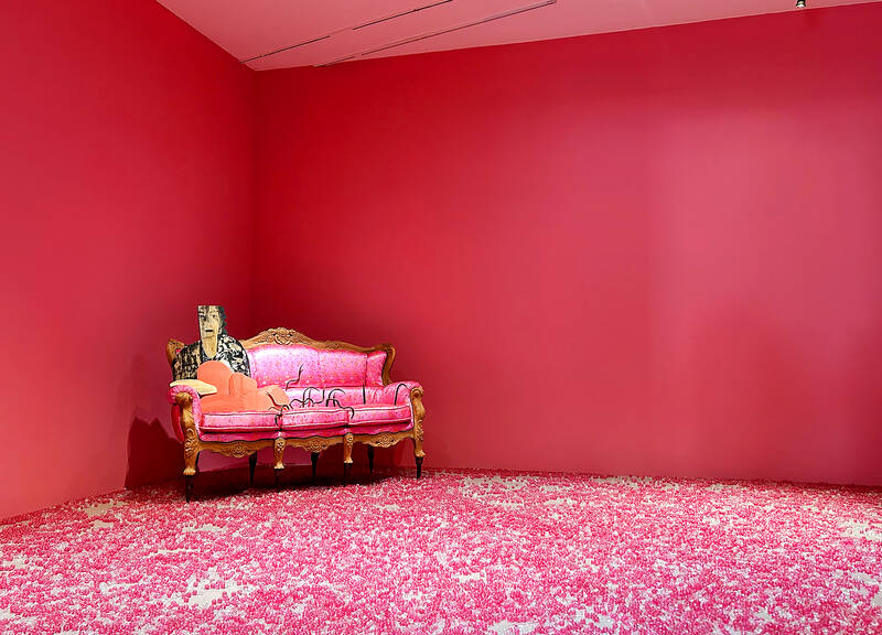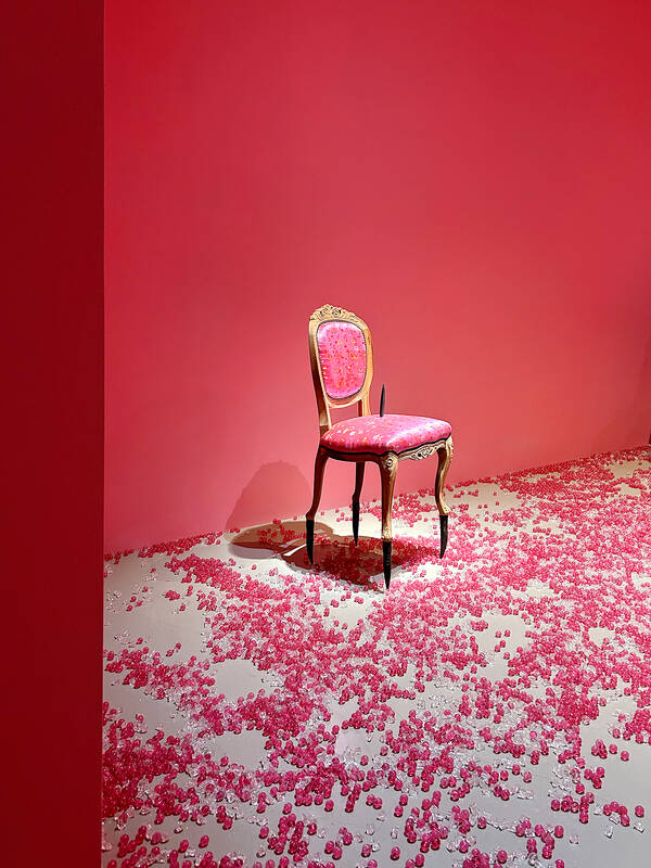 The room glows vibrant pink, the floor flooded with hundreds of tiny pink marbles. As I approach the two chairs and a plush baroque sofa of matching fuchsia, what at first appears to be a scene of domestic bliss reveals itself to be anything but as gnarled metal nails and sharp spikes protrude from the cushions. An eerie cutout of a woman recoils into the armrest.
