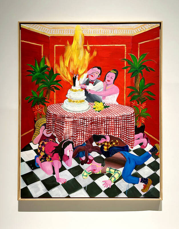This section features Huang Hai-hsin’s (黃海欣) Marriage Crisis (婚姻危機, 2012), which depicts a bride and groom, their wedding cake ablaze while guests choke on the fumes at the couple’s feet. The oil painting explores marriage as both a societal expectation and personal choice, reflecting the dilemmas faced by young Taiwanese women.