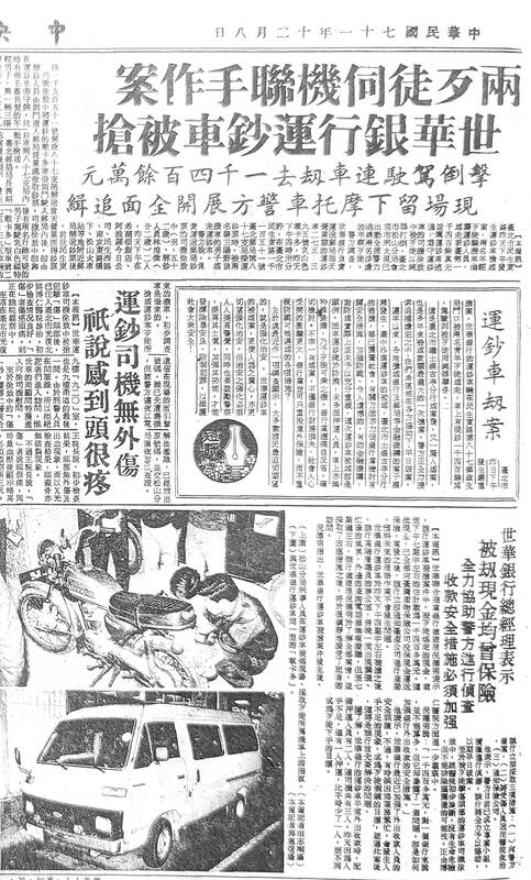 In the afternoon of Dec. 7, 1982, two masked men armed with M16 assault rifles knocked out the driver of a United World Chinese Commercial Bank (世華銀行) security van, making away with NT$14 million (worth about NT$30 million today). The van had been parked behind a post office at Taipei’s Minsheng E Road when the robbers struck, and despite the post office being full of customers, nobody inside had noticed the brazen theft.