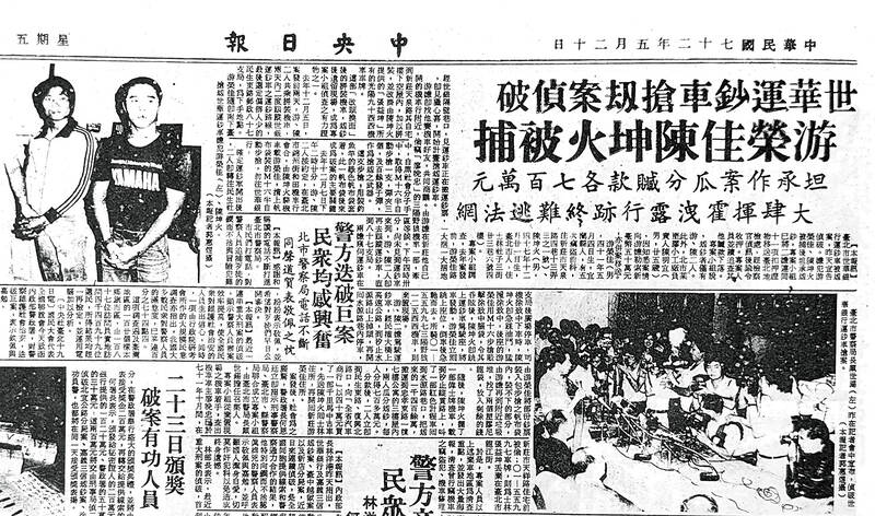 Eight months earlier, Taiwan witnessed its first armed bank robbery when Lee Shih-ke (李師科) made off with about NT$5.3 million from the Land Bank of Taiwan’s Guting branch (see “Taiwan in Time: The robber in the sanitary mask,” April 9, 2017). And on the same day as the robbery, gunmen barged into the Chiayi District Court in broad daylight and broke out a detainee.